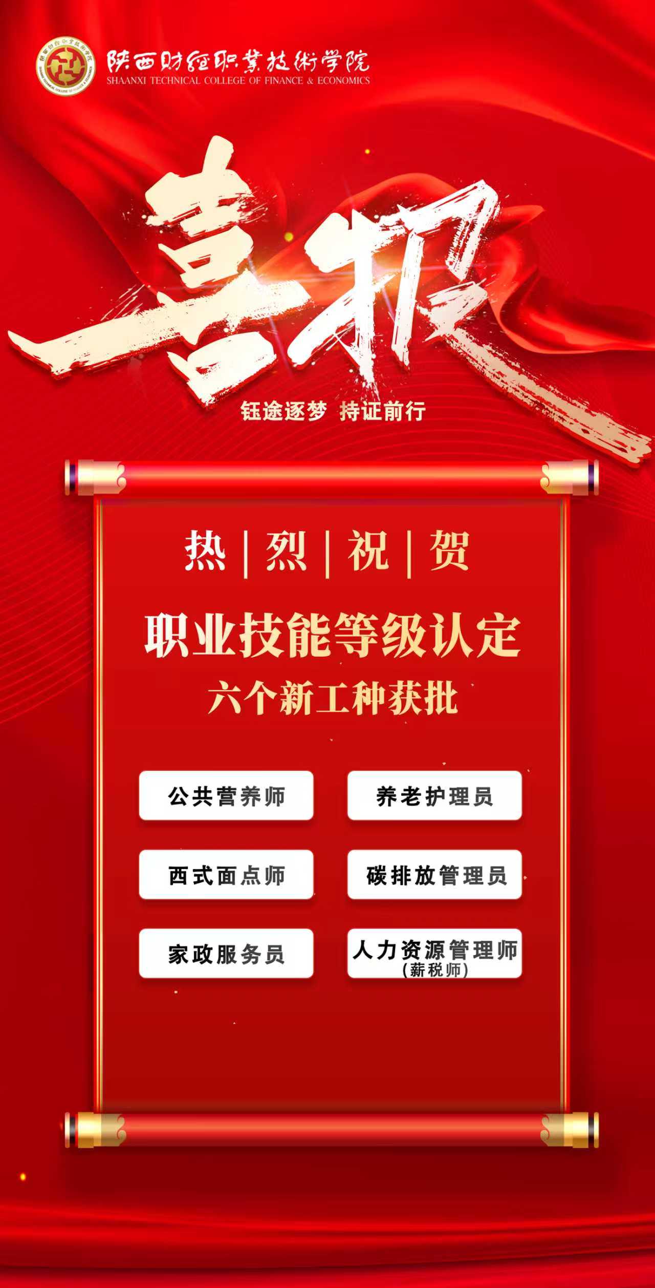近日,喜讯传来!陕西财经职业技术学院继续教育学院牵头申报的人力资源管理师(薪税师)、公共营养师、养老护理员、西式面点师、碳排放管理员、家政服务员六项职业技能等级认定新工种,顺利通过人力资源和社会保障局严格审核,正式获批!